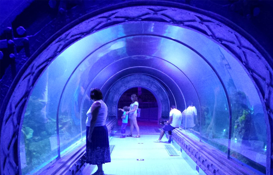 Посещение океанариума Тоннели-аквариумы, акулы/скаты/мурены и др. ~1–1.5 часа. Фото без вспышки.